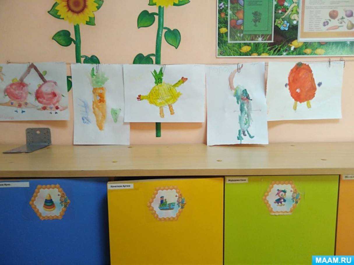 Воспитатель показывает работы детей, обсуждает выполненную работу