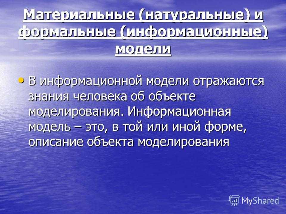 Материальные (натуральные) и формальные (информационные) модели В информационной модели отражаются знания человека об объекте моделирования. Информационная модель – это, в той или иной форме, описание объекта моделирования