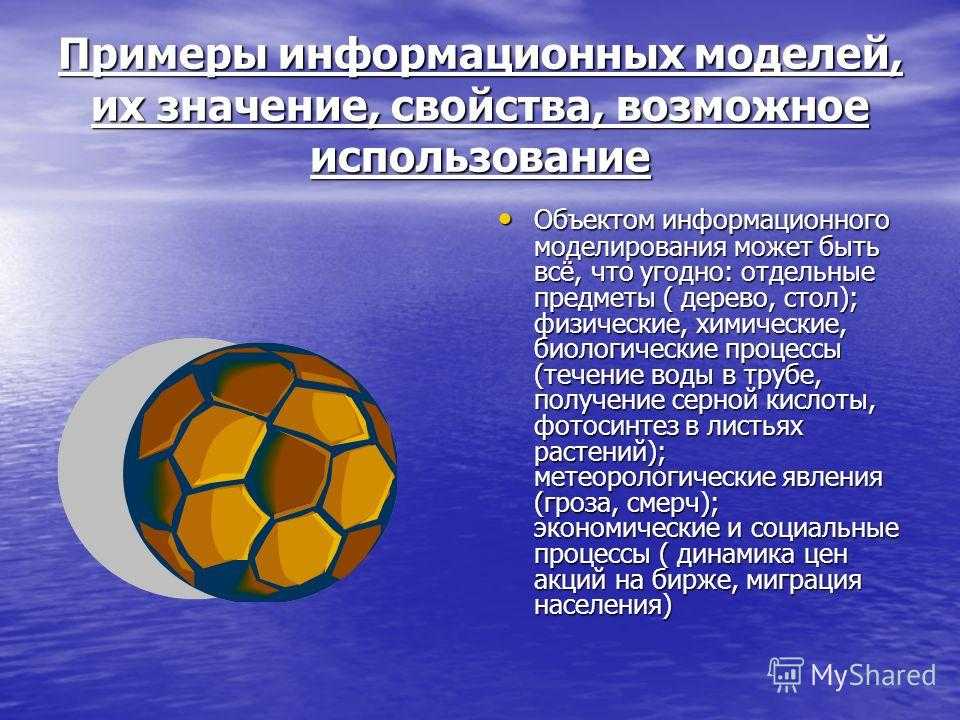 Примеры информационных моделей, их значение, свойства, возможное использование Объектом информационного моделирования может быть всё, что угодно: отдельные предметы ( дерево, стол); физические, химические, биологические процессы (течение воды в трубе, получение серной кислоты, фотосинтез в листьях растений); метеорологические явления (гроза, смерч); экономические и социальные процессы ( динамика цен акций на бирже, миграция населения) Объектом информационного моделирования может быть всё, что угодно: отдельные предметы ( дерево, стол); физические, химические, биологические процессы (течение воды в трубе, получение серной кислоты, фотосинтез в листьях растений); метеорологические явления (гроза, смерч); экономические и социальные процессы ( динамика цен акций на бирже, миграция населения)