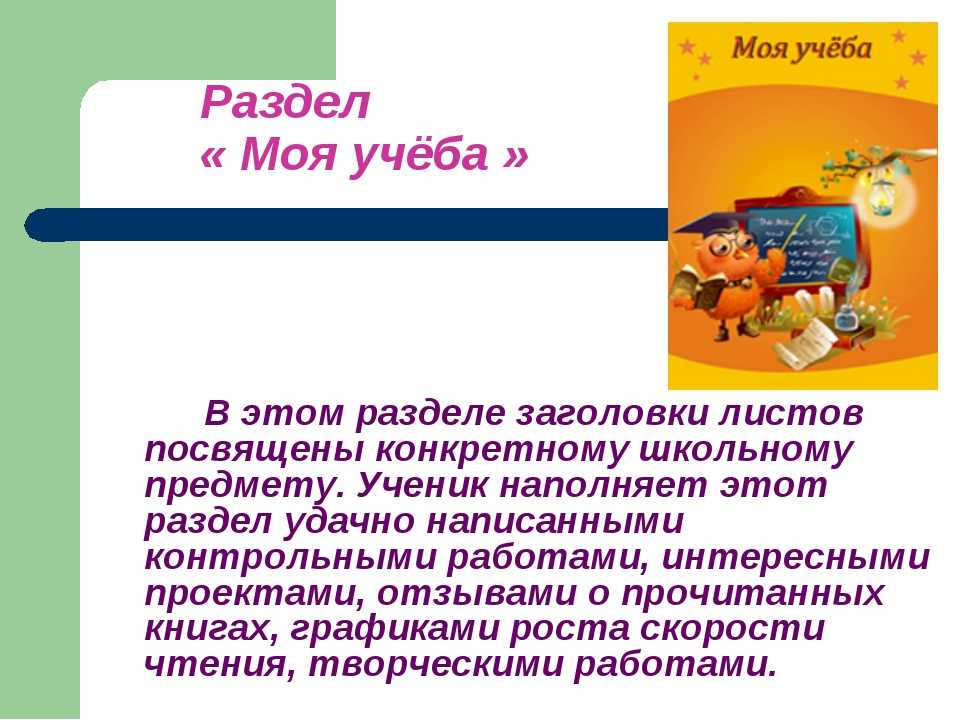 На этом личная часть портфолио заканчивается и начинается учебная. Следует указать классного руководителя, описать, какие предметы изучает школьник, какие внешкольные кружки посещает.