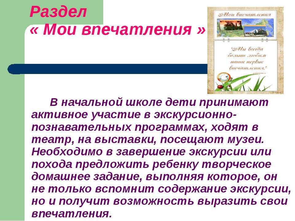 Раздел «Мои впечатления» очень важен для ребенка, который только пошел в школу. Так он может выразить свои эмоции, систематизировать свои мысли.