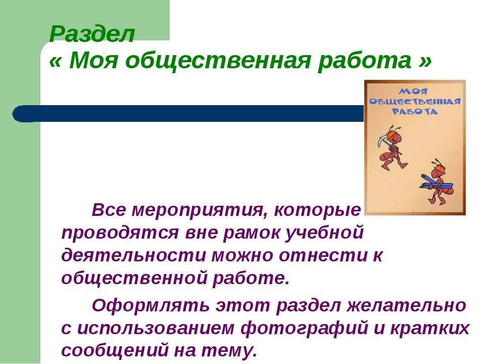 Все события, которые произошли вне школы, можно поместить в раздел «Моя общественная работа». Фотографии, размещенные тут, помогут сохранить в памяти эти события.