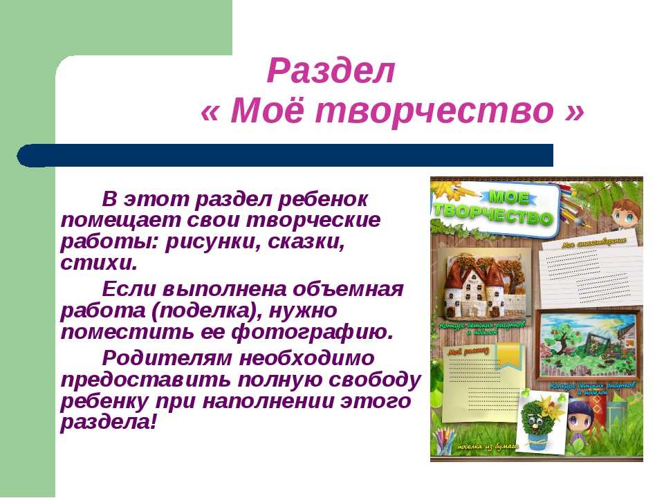 «Мое творчество» также может состоять из множества примеров творческих работ ученика. Лучше всего располагать их в хронологическом порядке, чтобы был виден прогресс творческих навыков ребенка.
