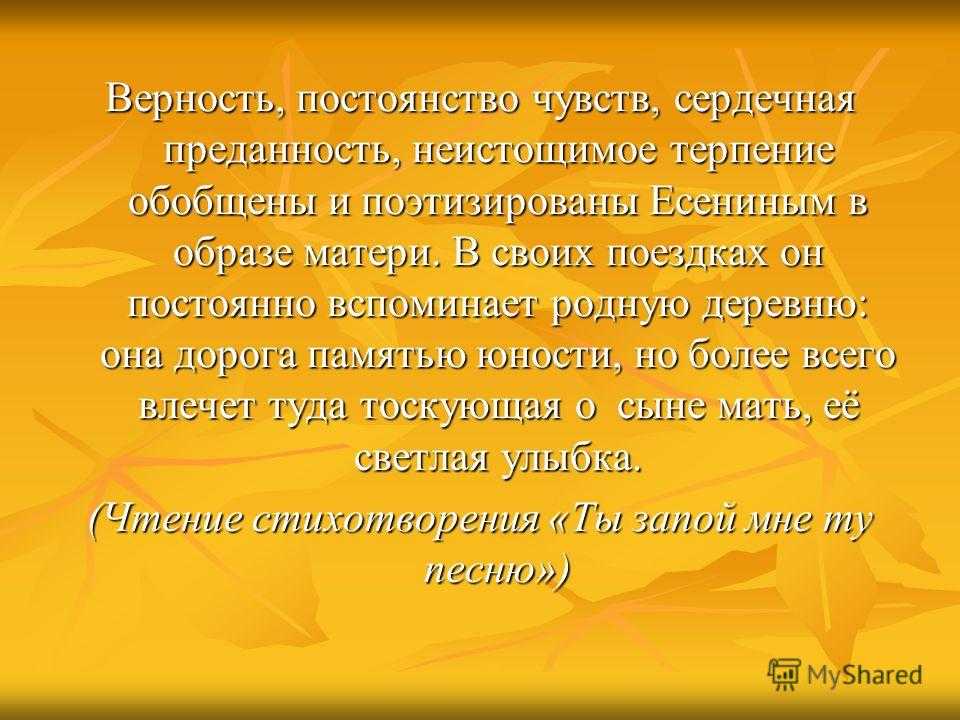 Верность, постоянство чувств, сердечная преданность, неистощимое терпение обобщены и поэтизированы Есениным в образе матери. В своих поездках он постоянно вспоминает родную деревню: она дорога памятью юности, но более всего влечет туда тоскующая о сыне мать, её светлая улыбка. (Чтение стихотворения «Ты запой мне ту песню»)