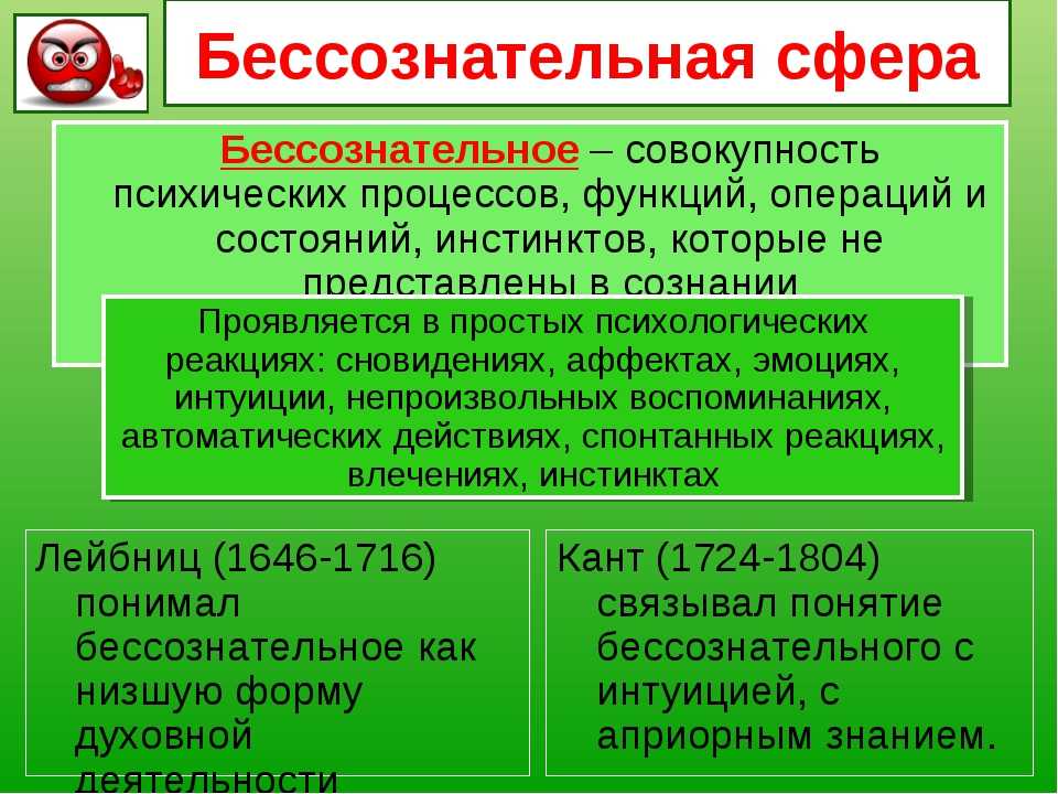 Основной проблемой для людей при наличии данных переживаний принято считать отсутствие субъективного контроля. Бессознательное в психологии или подсознание обозначает такие психические процессы, которые не могут найти отражение в сознании индивида, то есть абсолютно не управляются его волей. Среди основных видов проявления можно выделить представленные в списке ниже.