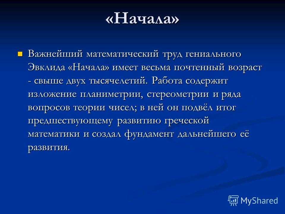 «Начала» Важнейший математический труд гениального Эвклида «Начала» имеет весьма почтенный возраст — свыше двух тысячелетий. Работа содержит изложение планиметрии, стереометрии и ряда вопросов теории чисел; в ней он подвёл итог предшествующему развитию греческой математики и создал фундамент дальнейшего её развития. Важнейший математический труд гениального Эвклида «Начала» имеет весьма почтенный возраст — свыше двух тысячелетий. Работа содержит изложение планиметрии, стереометрии и ряда вопросов теории чисел; в ней он подвёл итог предшествующему развитию греческой математики и создал фундамент дальнейшего её развития.