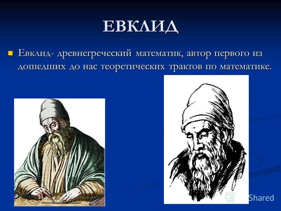 ЕВКЛИД Евклид- древнегреческий математик, автор первого из дошедших до нас теоретических трактов по математике. Евклид- древнегреческий математик, автор первого из дошедших до нас теоретических трактов по математике.