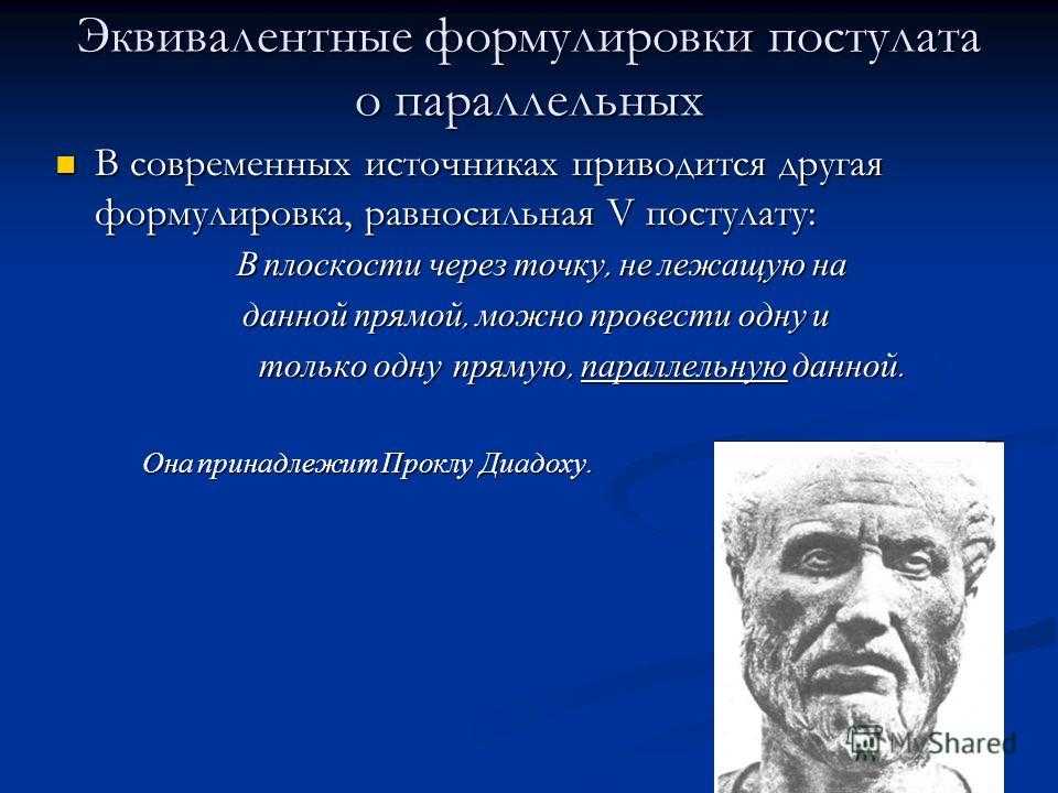 Эквивалентные формулировки постулата о параллельных В современных источниках приводится другая формулировка, равносильная V постулату: В современных источниках приводится другая формулировка, равносильная V постулату: В плоскости через точку, не лежащую на В плоскости через точку, не лежащую на данной прямой, можно провести одну и данной прямой, можно провести одну и только одну прямую, параллельную данной. только одну прямую, параллельную данной. Она принадлежит Проклу Диадоху. Она принадлежит Проклу Диадоху.