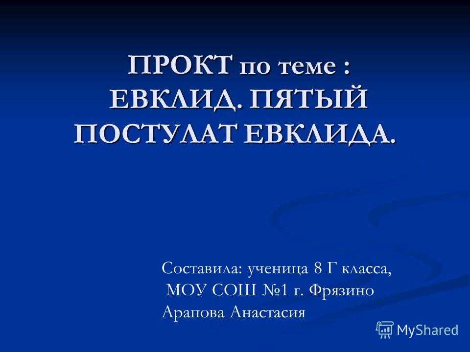 Презентация 8 класса на тему: «ПРОКТ по теме : ЕВКЛИД. ПЯТЫЙ ПОСТУЛАТ ЕВКЛИДА. ПРОКТ по теме : ЕВКЛИД. ПЯТЫЙ ПОСТУЛАТ ЕВКЛИДА. Составила: ученица 8 Г класса, МОУ СОШ 1 г. Фрязино Арапова.». Скачать бесплатно и без регистрации. — Транскрипт: