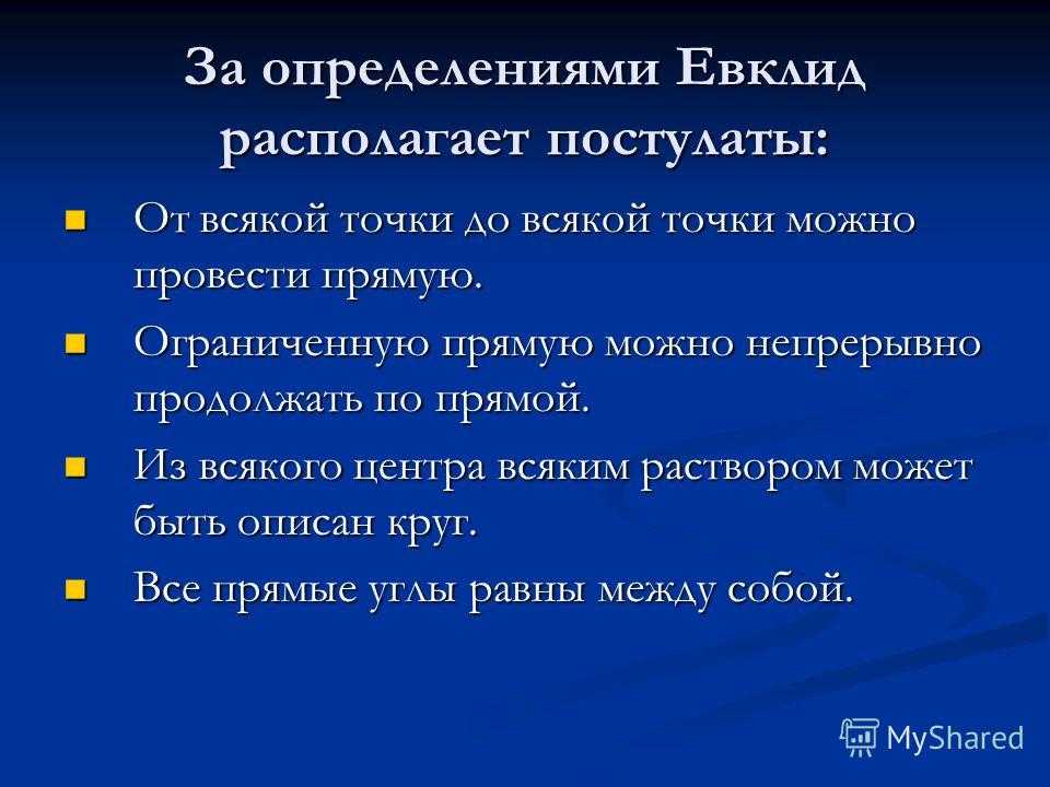 За определениями Евклид располагает постулаты: От всякой точки до всякой точки можно провести прямую. От всякой точки до всякой точки можно провести прямую. Ограниченную прямую можно непрерывно продолжать по прямой. Ограниченную прямую можно непрерывно продолжать по прямой. Из всякого центра всяким раствором может быть описан круг. Из всякого центра всяким раствором может быть описан круг. Все прямые углы равны между собой. Все прямые углы равны между собой.