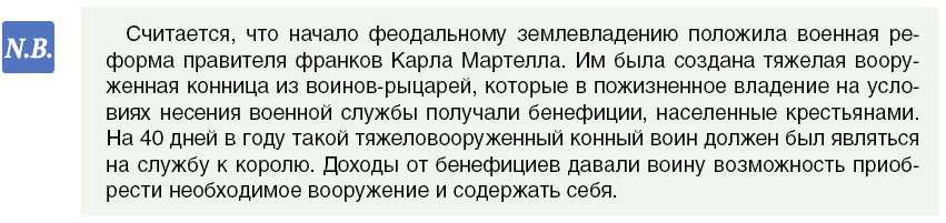 Кроме того, частые войны и неурожаи, от которых страдали крестьяне, вынуждали их искать защиты у феодалов. Таким образом, получая поддержку от крупного земельного собственника, крестьяне становились поземельно или даже лично зависимыми от господина. Они теряли право собственности на свои наделы и не могли покидать эту землю, были вынуждены работать на ней. Происходило закрепощение, или прикрепление крестьян к земельным наделам. Так возникло крепостное право.В VIII в. во Франкском государстве произошли аграрные преобразования, в результате которых господствующей формой земельного владения стал бенефиций.