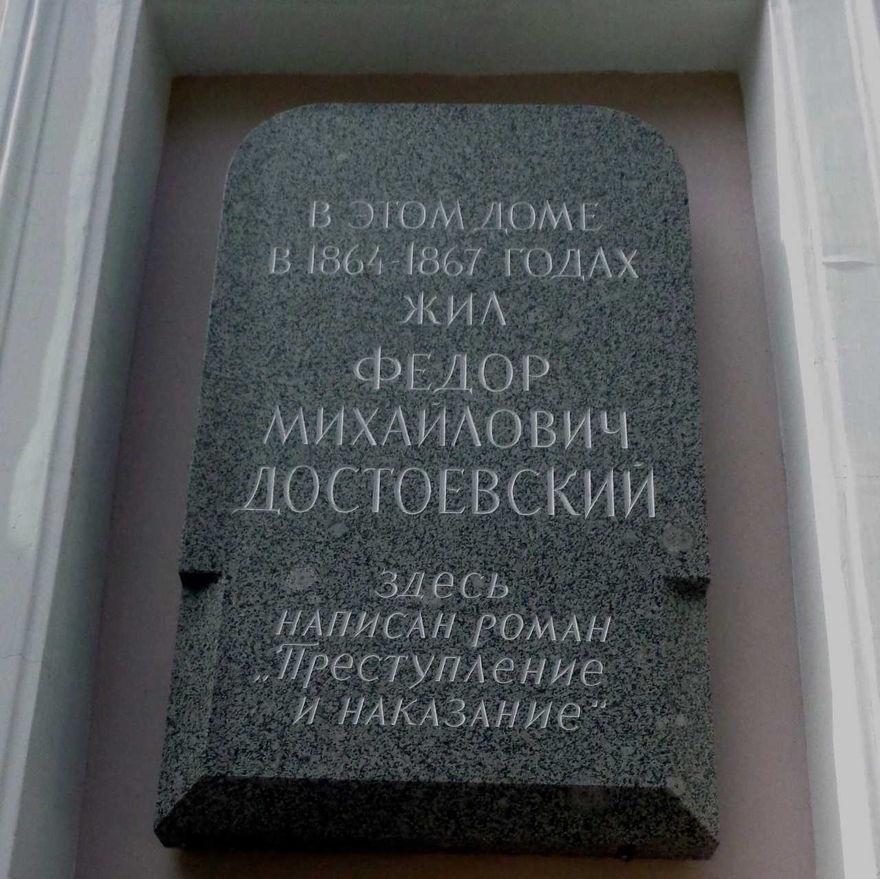 Сейчас на доме висит мемориальная доска. Именно здесь Достоевский и писал «Преступление и наказание». Адрес: Казначейская 7, дом где жил в 1864-67 гг. Достоевский