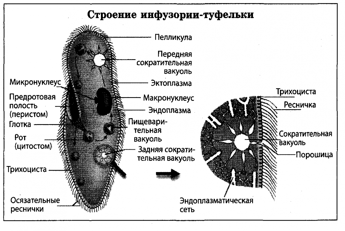 Среди пресноводных простейших животных одна туфелька имеет наиболее сложное строение. Внутри инфузории имеются сразу два ядра: большое и малое. Большое ядро регулирует все жизненные процессы, маленькое — играет важную роль в размножении туфельки.