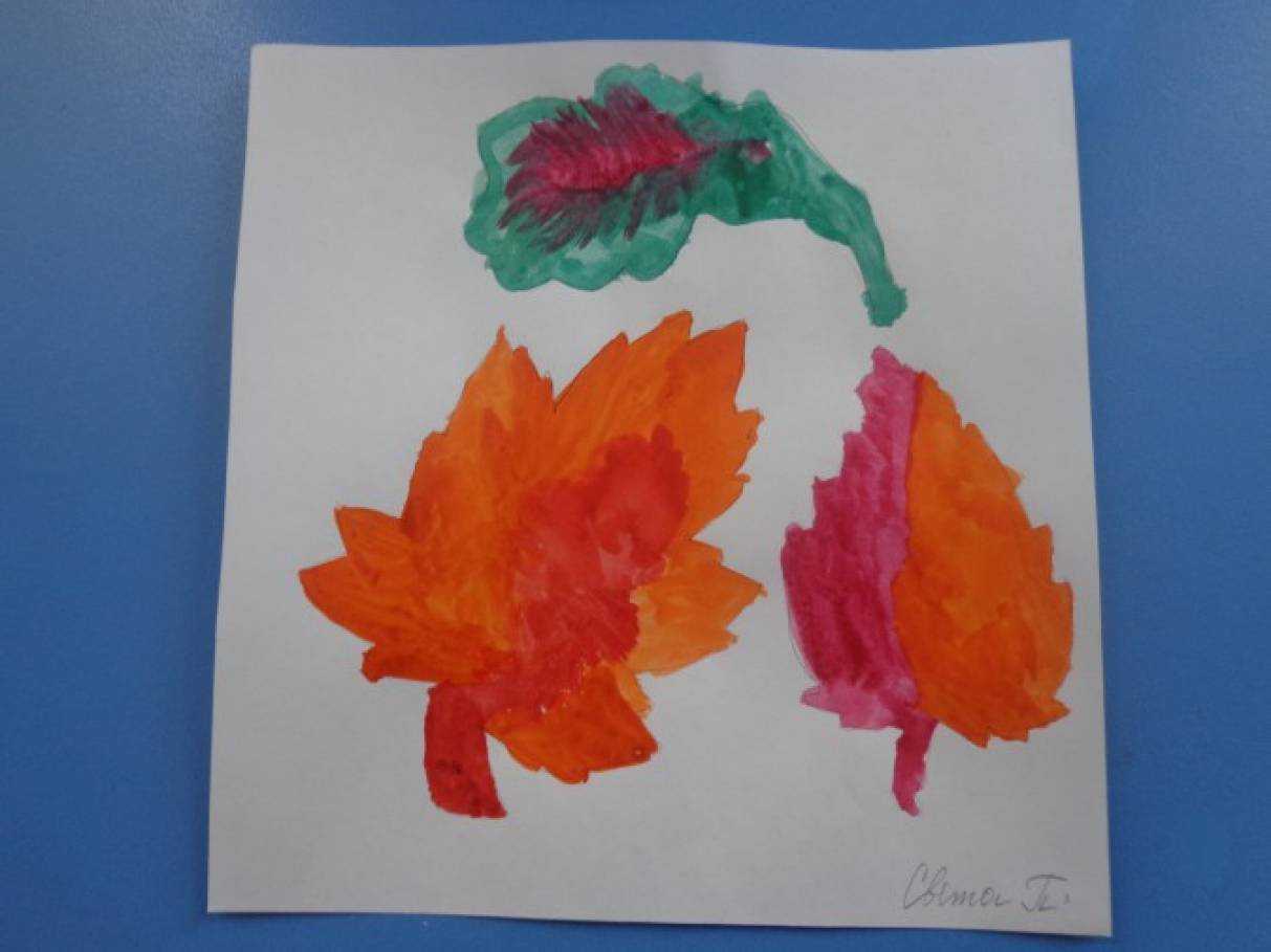 Воспитатель: Вот лист каштана похож на корону. Осень окрасила этот лист в желтый цвет как будто золотую корону. А этот лист клена, он напоминает ладошку с растопыренными пальцами. Для кленового листа осень припасла оранжево-желтую краску. Весь листок сначала раскрасила оранжевой краской, а потом смешала оранжевую и желтую.