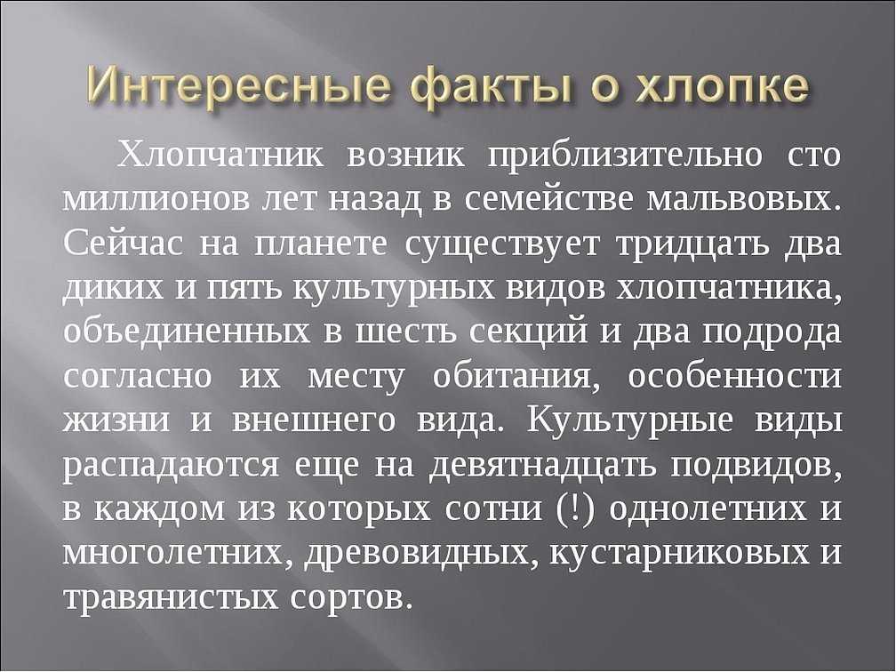 Самый распространенный материал во всем мире — это хлопок. Из него изготавливают разные предметы, начиная от одежды и заканчивая предметами интерьеров. Так как материал используется очень давно, за все время его существования сложились следующие интересные факты: