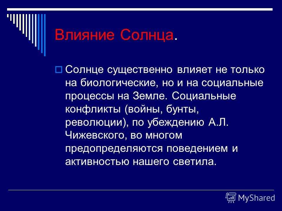 Влияние Солнца. Солнце существенно влияет не только на биологические, но и на социальные процессы на Земле. Социальные конфликты (войны, бунты, революции), по убеждению А.Л. Чижевского, во многом предопределяются поведением и активностью нашего светила.