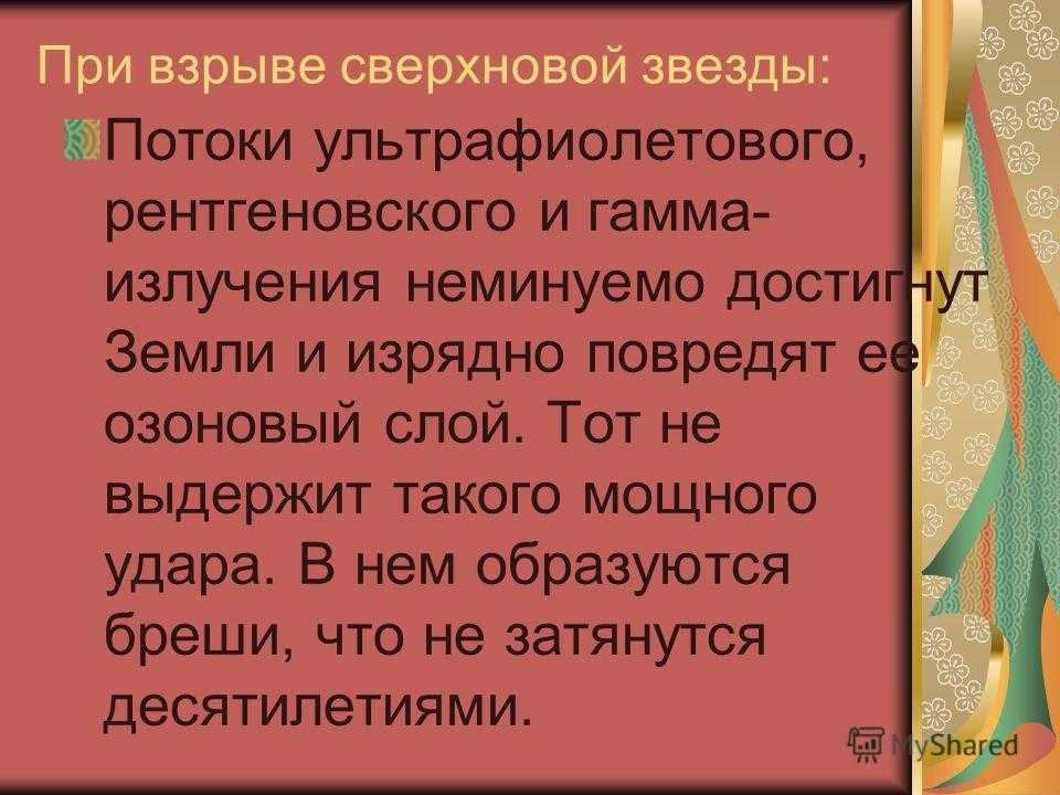 Взрыв сверхновой звезды. Если же сверхновая звезда взорвется всего в десяти световых годах от Земли, то поток космических лучей увеличится в сотни раз. Весь озоновый щит попросту сметет Если же сверхновая звезда взорвется всего в десяти световых годах от Земли, то поток космических лучей увеличится в сотни раз. Весь озоновый щит попросту сметет