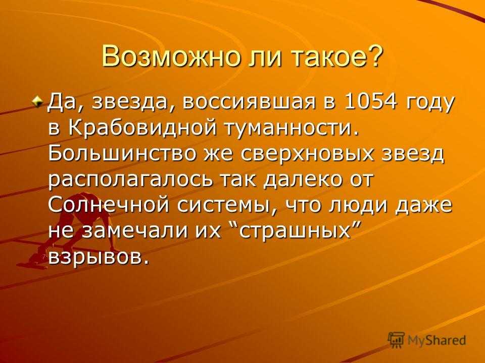 Возможно ли такое? Да, звезда, воссиявшая в 1054 году в Крабовидной туманности. Большинство же сверхновых звезд располагалось так далеко от Солнечной системы, что люди даже не замечали их страшных взрывов.