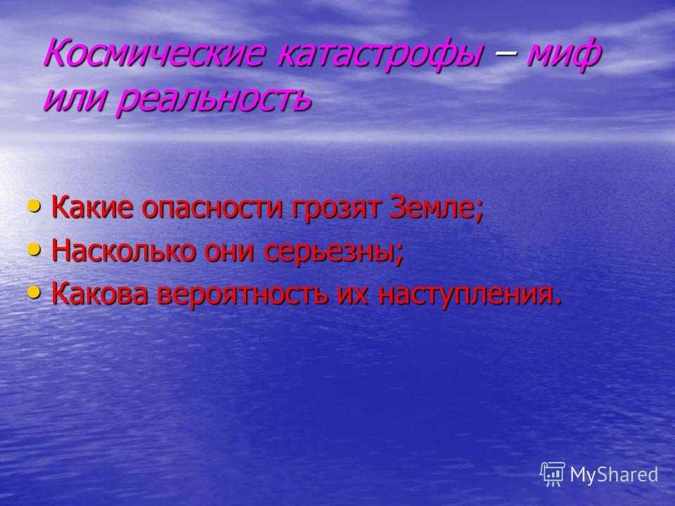 Космические катастрофы – миф или реальность Какие опасности грозят Земле; Какие опасности грозят Земле; Насколько они серьезны; Насколько они серьезны; Какова вероятность их наступления. Какова вероятность их наступления.