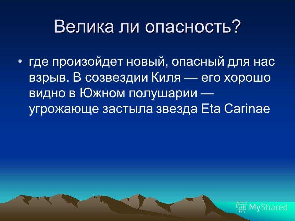 Велика ли опасность? где произойдет новый, опасный для нас взрыв. В созвездии Киля его хорошо видно в Южном полушарии угрожающе застыла звезда Eta Carinae