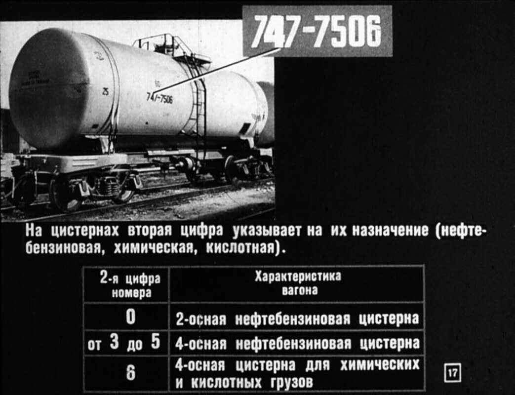 Следующие важные данные были зашифрованы во второй и третьей цифре номера, четвертая, пятая и шестая, как уже упоминалось, это инвентарный номер транспортной единицы. Вторая и третья цифры в отношении вагонов разного рода обозначали разные характеристики. В отношении крытых моделей вторая цифра 0, или 1 показывали что вагоны и платформы построены на двухосной тележке. Шестиосные обозначались цифрой 8, четырехосные полувагоны — цифрами 2,3,4,5,6, четырехосные платформы обозначались цифрой 7, а восьмиосные — 9. Похожие числа использовались и для цистерн — 0 и 1 указывали на двухосную конструкцию, 3,4,5 — на четыре оси, для ГСМ. Четырехосные цистерны для других химических грузов обозначались цифрой 6 на втором месте, а для остальных типов наливного груза — 7. То есть, по второй цифре можно определить не только количество осей вагона, или цистерны, но и их назначение.