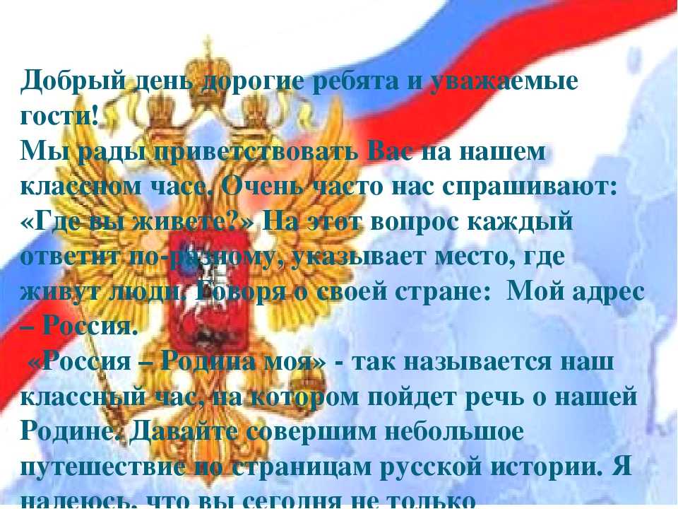 –Мы живём в великой стране. Россия занимает первое место по территории среди всех стран мира. Чтобы её пересечь с востока на запад, надо ехать на скором поезде целую неделю, а самолётом 15 часов. Россияне гордятся просторами и красотой своей Родины. Есть на российской земле горы, леса и степи, моря, реки и озёра.