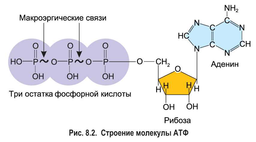 В состав молекулы АТФ входит аденин, рибоза и три остатка фосфорной кислоты (рис. 8.2). Таким образом, от обычного аденилового нуклеотида АТФ отличается наличием двух дополнительных фосфатных групп. Ковалентные связи между остатками фосфорной кислоты примечательны тем, что при их разрыве выделяется большое количество энергии — около 40 кДж/моль (для сравнения: при разрыве обычных ковалентных связей высвобождается примерно 12 кДж/моль). Такие высокоэнергетические связи называются макроэргическими.