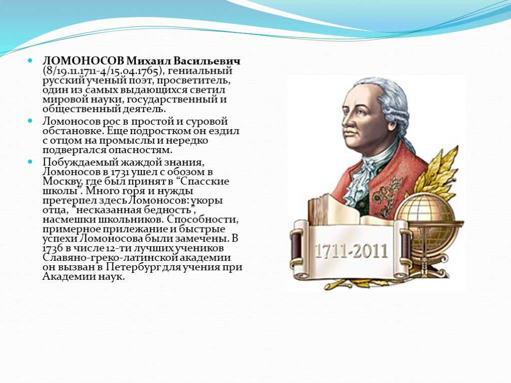 Михаил Васильевич Ломоносов — гений своего времени, сделавший огромный вклад в формирование науки. Он организовывал науку в Российской империи. Занимался астрономией, приборостроением, географией, металлургией, геологией, поэзией, филологией, историей, генеалогией, а также рисованием. В современной России его имя связано с Московским университетом, проект которого он создал.