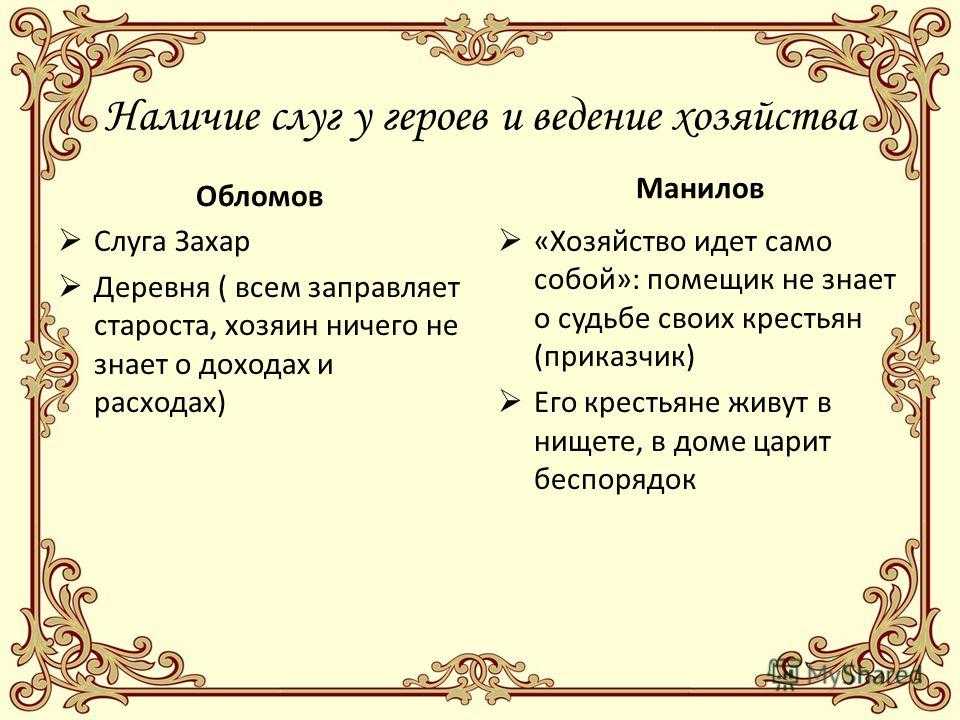 Друзья и светская жизнь героев Обломов Волков, Судьбинский, Пенкин; Алексеев Иван Алексеевич, Михей Андреевич Тарантьев, Андрей Иванович Штольц («человек действия») Не любит выезжать из дома, «не подъёмный» Манилов Чиновники уездного города, помещики (Ноздрев, Собакевич и т. д.) Предпочитает домашний уют, но не против поехать в город, в гости Не наговаривает на друзей