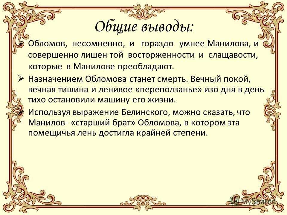 Общие выводы: Обломов, несомненно, и гораздо умнее Манилова, и совершенно лишен той восторженности и слащавости, которые в Манилове преобладают. Назначением Обломова станет смерть. Вечный покой, вечная тишина и ленивое «переползанье» изо дня в день тихо остановили машину его жизни. Используя выражение Белинского, можно сказать, что Манилов- «старший брат» Обломова, в котором эта помещичья лень достигла крайней степени.