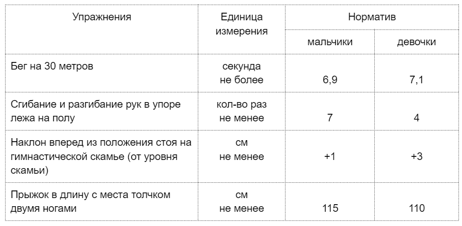 | Сгибание и разгибание рук в упоре лежа на полу | кол-во раз не менее | 7 | 4 |