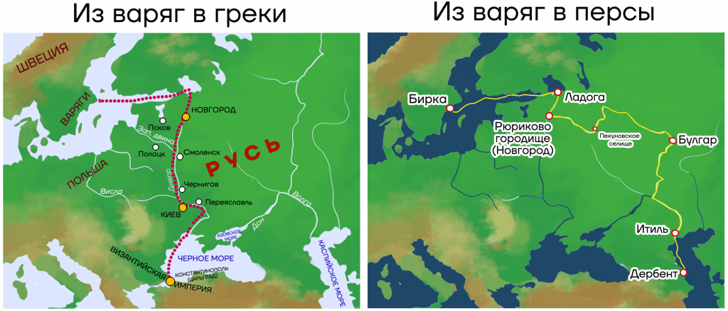 При работе с этими картами важно обратить внимание на такие моменты, как начало и окончание торгового пути, основные города и, соответственно, название торгового пути.Отметим важное:Торговый путь «Из варяг в греки» или «Днепровский торговый путь»:— основа торгового пути — река Днепр;— начало торгового пути — варяжские земли (Балтийское море);— окончание торгового пути — г. Константинополь (Черное море);— основные города на торговом пути — Новгород, Киев.Торговый путь «Из варяг в персы» или «Волжский торговый путь»:— основа торгового пути — река Волга;— начало торгового пути — варяжские земли (Балтийское море);— окончание торгового пути — г. Дербент (Каспийское море);— основные города на торговом пути — Новгород, Булгар (Волжская Булгария), Итиль (Хазарский каганат)