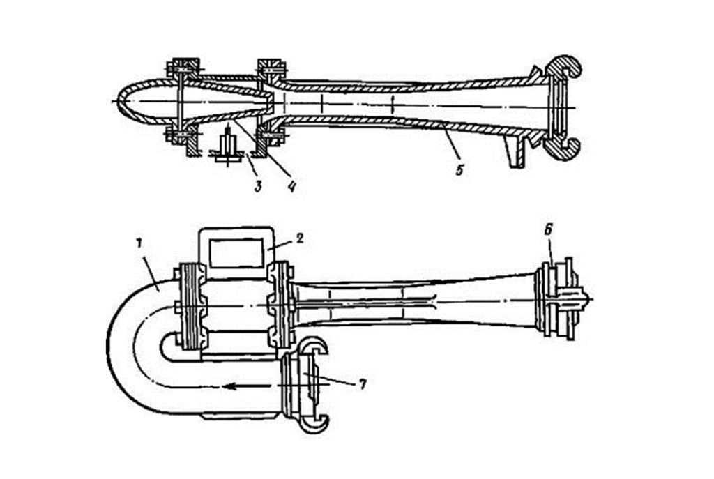 1 – колено; 2 – сетка всасывающая; 3 – обечайка; 4 – сопло; 5 – диффузор; 6 – головка соединительная ГМН-80; 7 – головка соединительная ГМН-70