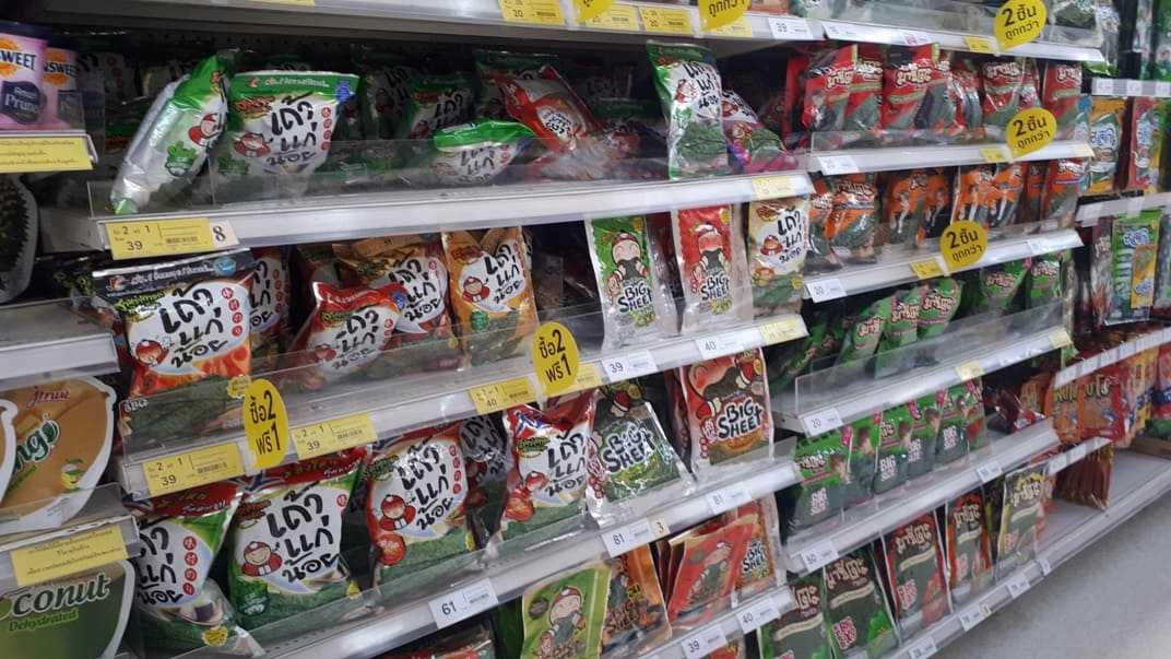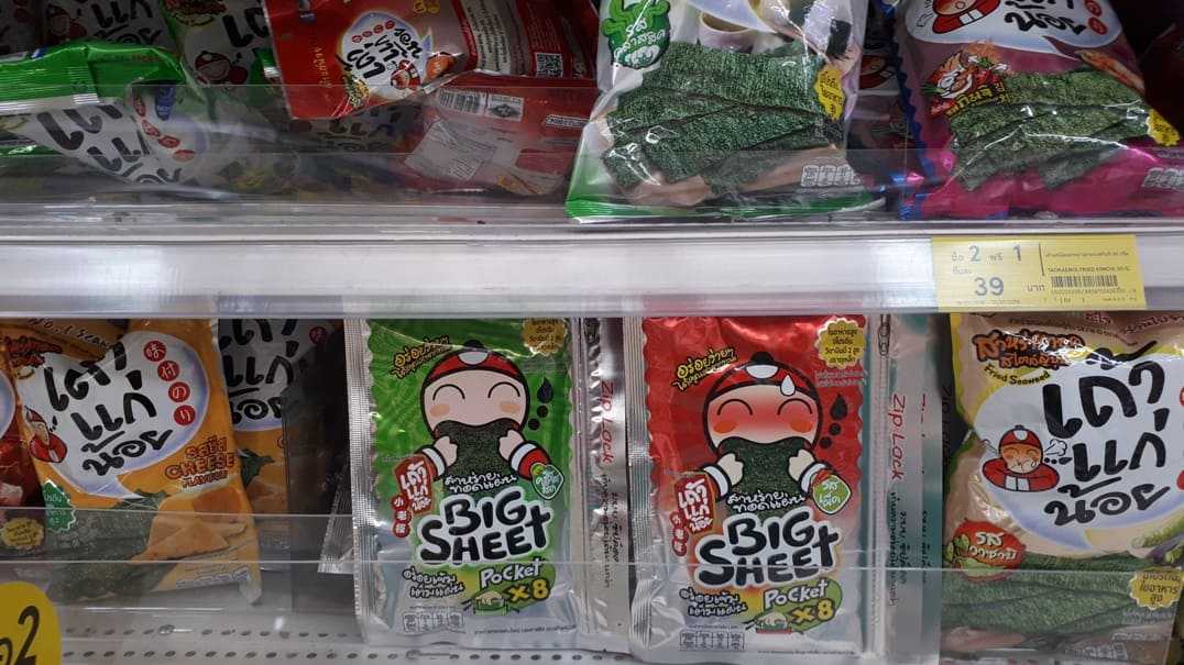 Не скажу что специально, будучи в Таиланде, я нашёл в супермаркете закуску из водорослей, очень там популярную. Про историю её возникновения и парня, придумавшего её и ставшего миллионером, снят целый фильм. Кстати, очень интересный, жизненный и поучительный фильм. Советую посмотреть. Вот статья об этом. Полки, заваленные продукцией из водорослей, впечатляют.
