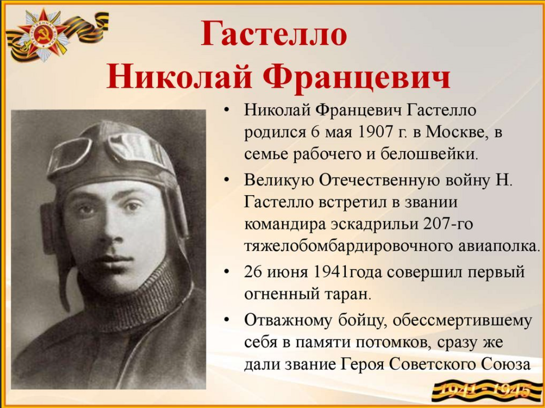 - Николай Гастелло (23 апреля (6 мая) 1907 — 26 июня 1941) — летчик. Самолет ДБ-3ф экипажа под командованием капитана Н. Ф.