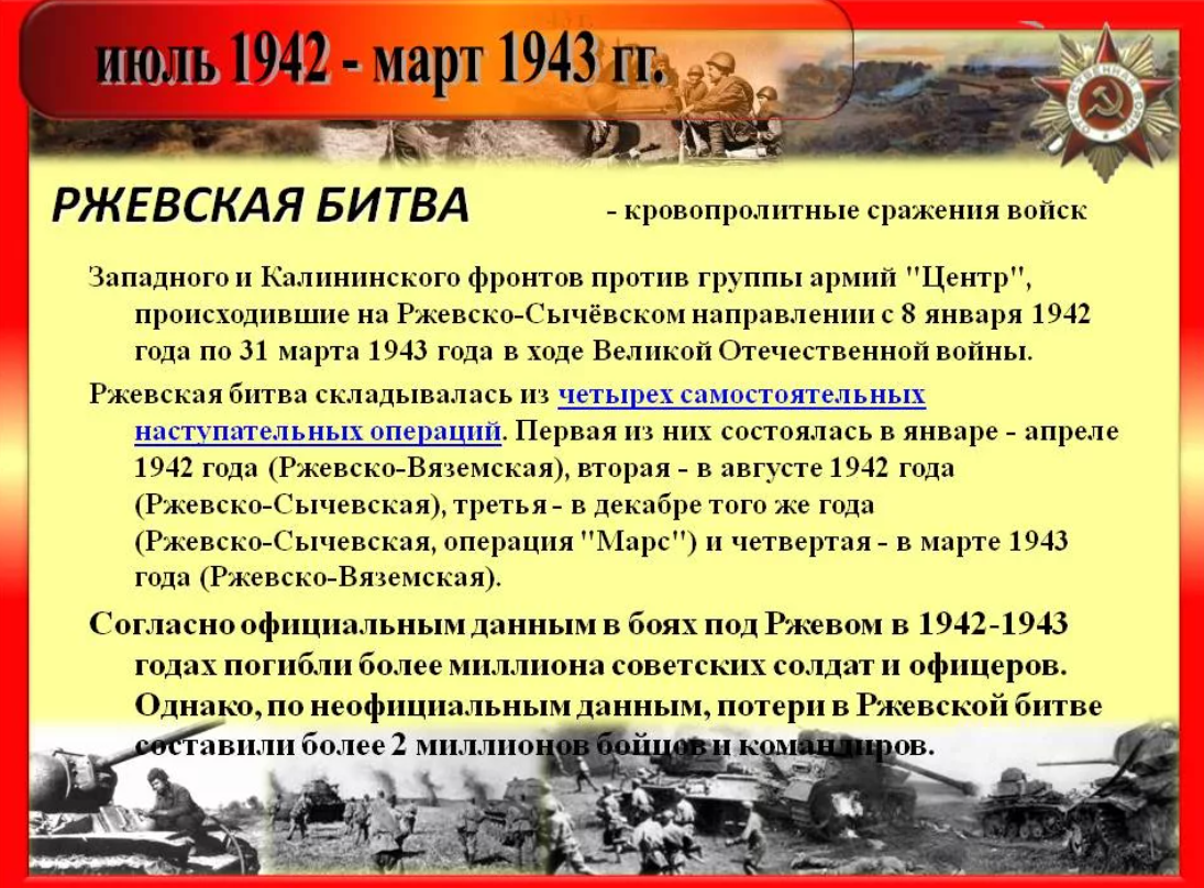 - Ржевская битва (8 января 1942 г. — 31 марта 1943 г.).