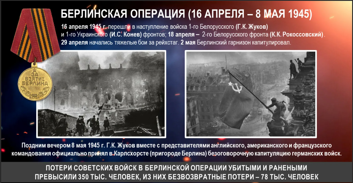 - Берлинская операция (16 апреля — 8 мая 1945 г.).