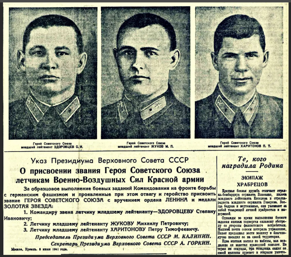 Пришлось нелегко нашим летчикам, именно они, сталинские соколы, принимали бой в воздухе. Многие отличились, но самыми первыми были Здоровцев С.И., Жуков М.П., Харитонов П.Т. При выполнении боевого задания, не думая о своей жизни, они пошли на таран самолетов врага.