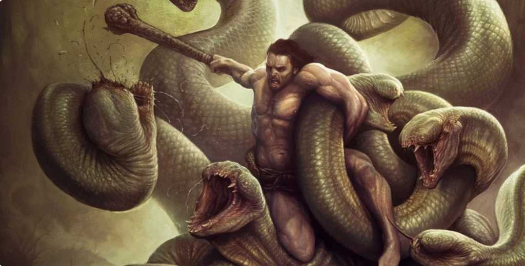 При виде ее Геракл достал меч и стал отрубать ей змеиные головы, но вместо одной старой выросли 2 новые. Каждый удар делал монстра еще более сильным и опасным. Кроме того, Гера еще и наслала на героя рак, который сильно ранил его в ногу.