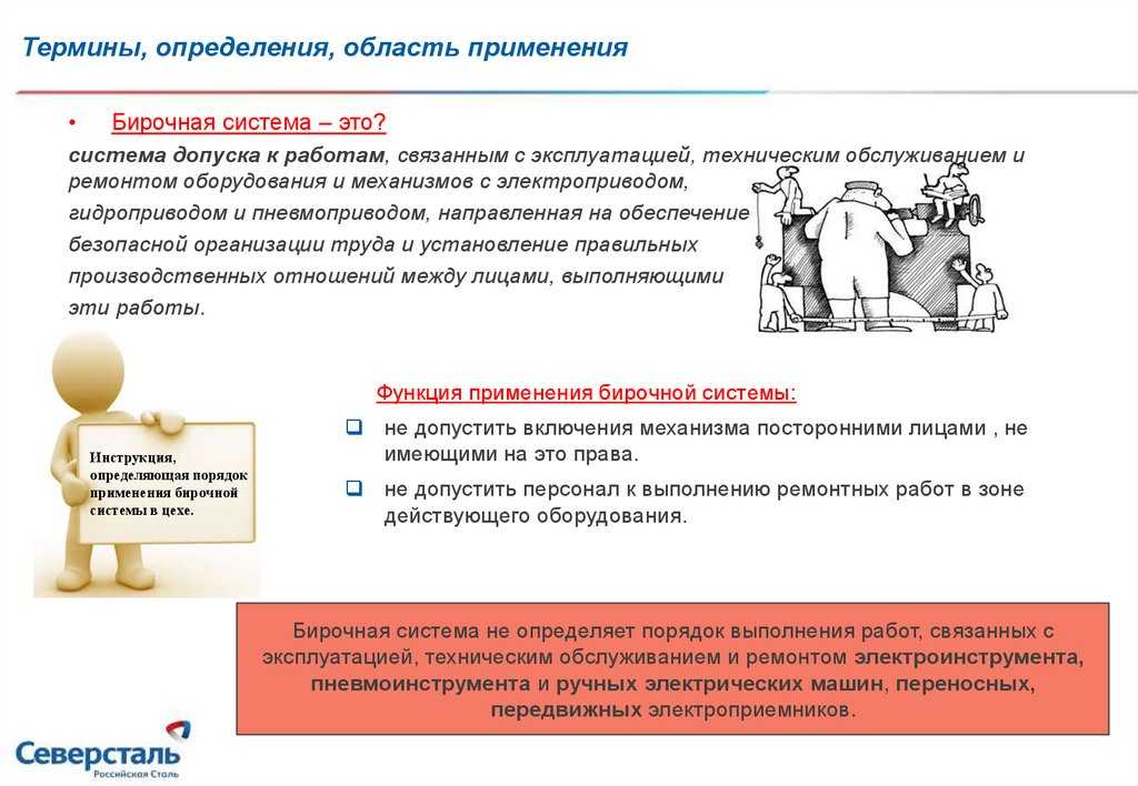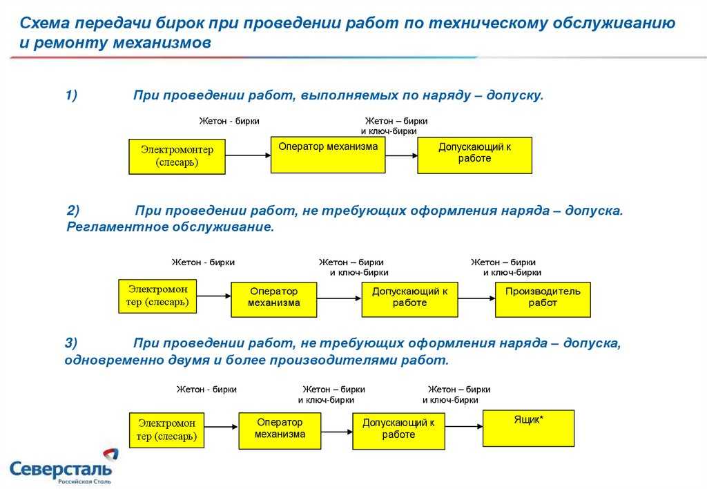 Нарядно-допускная система сводится, как правило, к информированию персонала о содержании работ, мерах безопасности и возможных связанных с ними рисках. Широко распространенная бирочная система предполагает, что на пультах управления источниками любых энергий вывешиваются предупреждающие бирки, чтобы, например, сотрудник случайно не включил электрическое напряжение во время ремонтных работ на опасном участке.