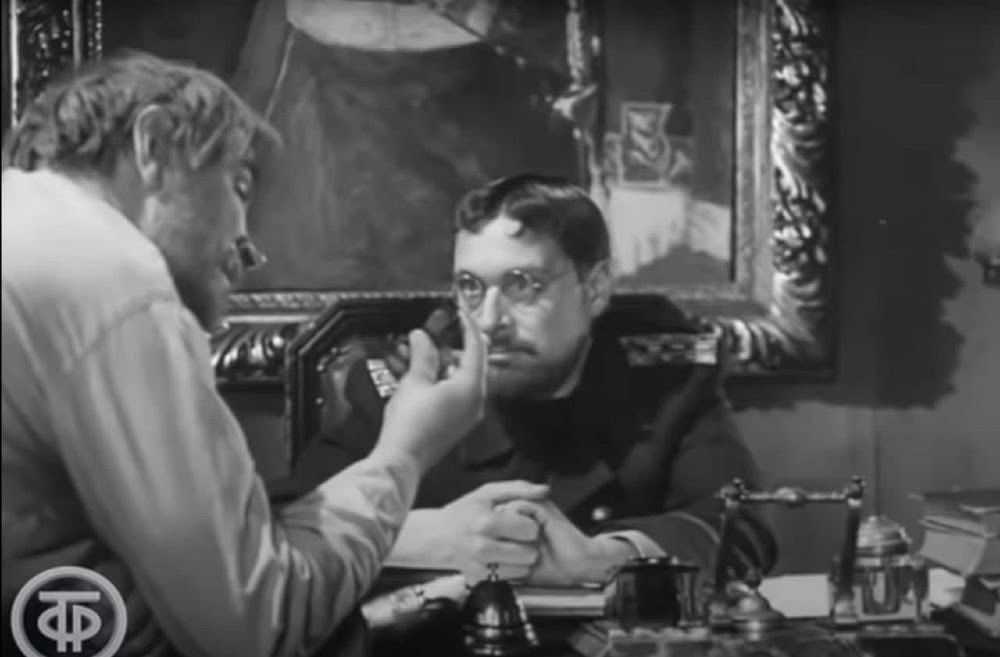 Кадр из телеспектакля «А.Чехов. Сценки». В роли следователя Олег Басилашвили, в роли Григорьева — Евгений Лебедев