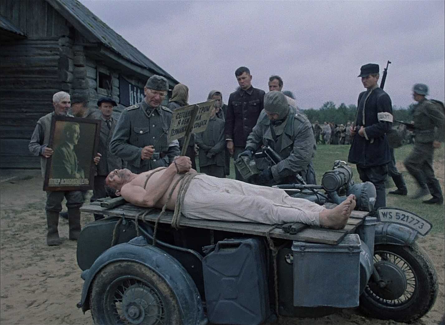 Карательная операция закончена, деревня полыхает. Нацисты покидают село, но внезапно появившиеся партизаны разбивают отряд, взяв в плен несколько немецких офицеров и их прихлебателей из местных. Эта сцена самая сильная в фильме. Она наиболее ясно показывает отличие двух миров, столкнувшихся во Второй мировой войне.