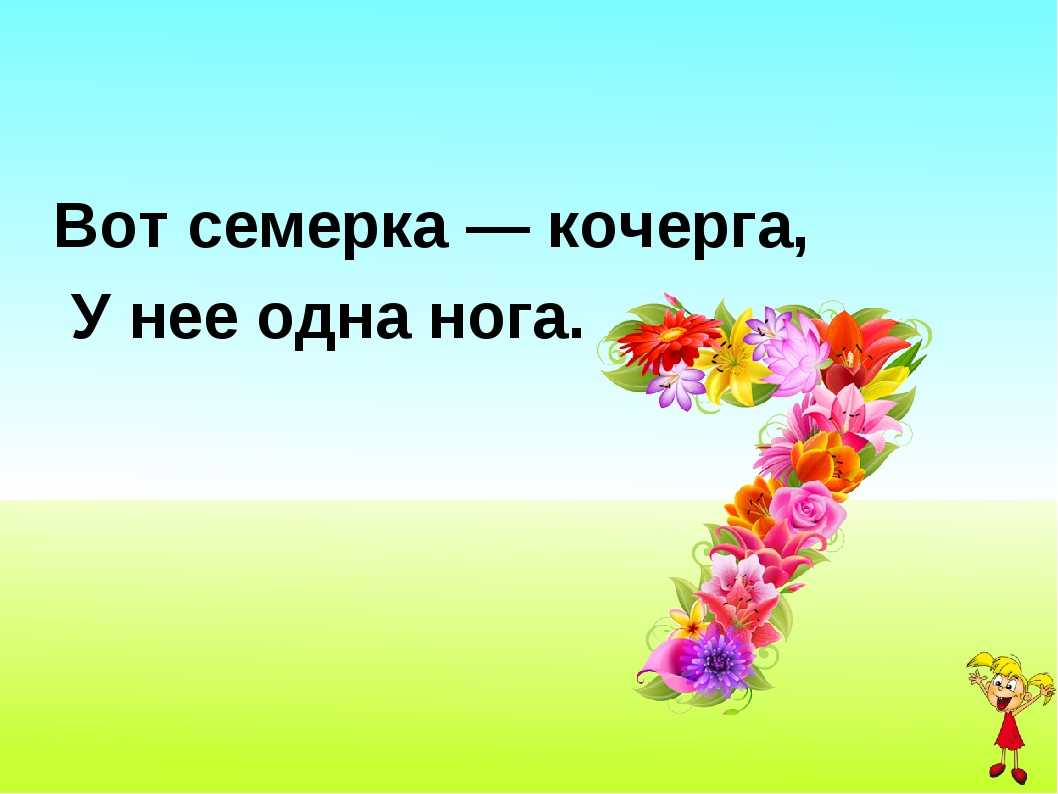 Цифра 7 очень необычная в истории русской культуры. О ней слагались сказки, пословицы, поговорки, стихи¸ загадки. Современные авторы придумывают новые истории и даже ребусы, чтобы детям интереснее было изучать эту цифру. В методиках преподавания математики для учителя, который идет на урок в 1 класс, применяются фото, картинка, презентация. Их можно скачать у нас на сайте бесплатно.