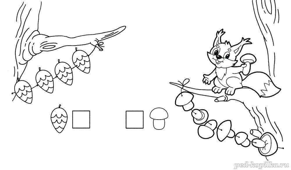 №2. Белочка собрала шишки и грибы. Сосчитай их, впиши в квадратики соответствующие цифры. Чего больше, шишек или грибов? Раскрась картинку.
