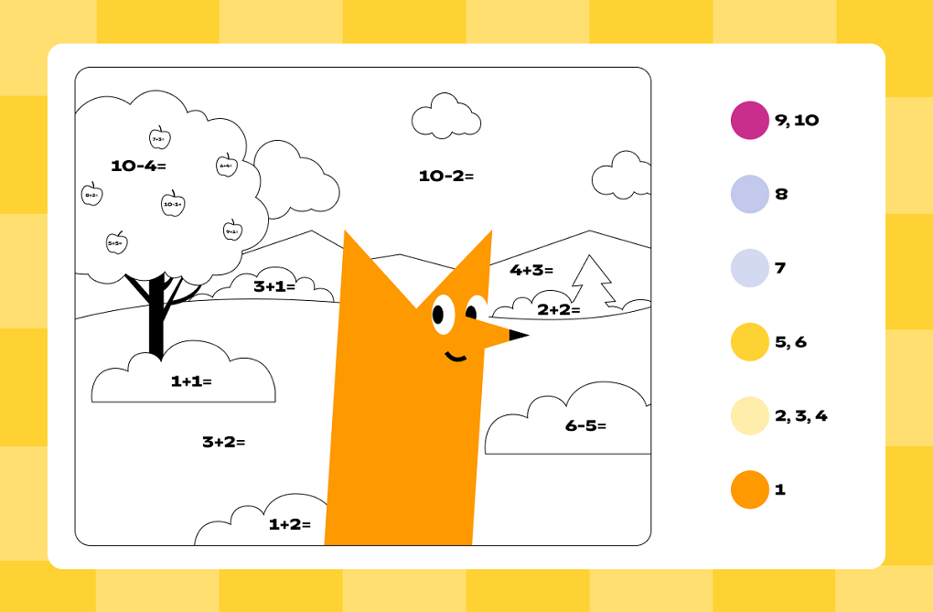 Ребёнку нужно складывать или вычитать, то есть решать примеры. Значение соответствует цвету, которым нужно раскрасить часть картинки.