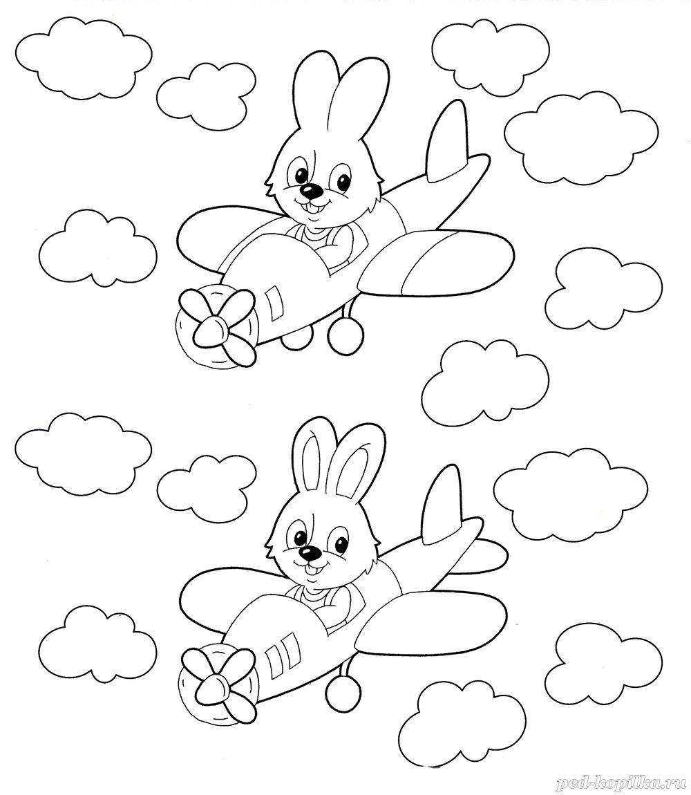 №17. Найди отличия между зайчиками и их самолётами и дорисуй недостающие детали так, чтобы картинки стали одинаковыми. Раскрась картинки