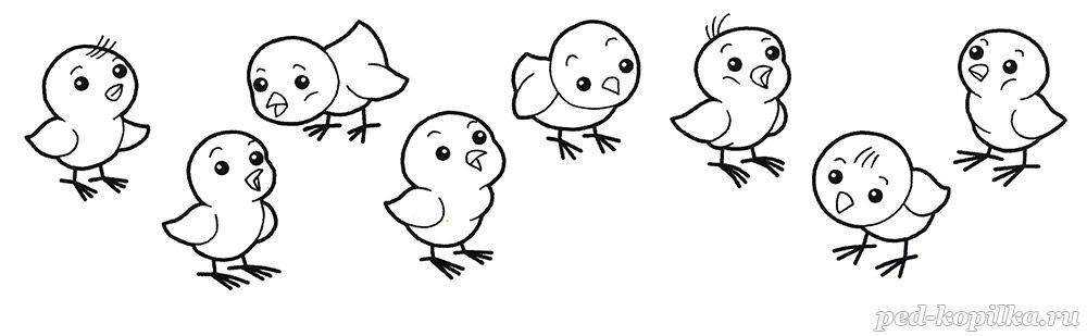№14. Раскрась цыплят, которые повернулись направо, жёлтым карандашом, а цыплят, которые повернулись налево – оранжевым.