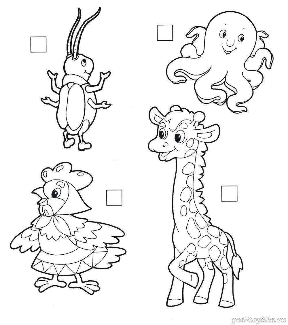 №13. У кого сколько ног? Сосчитай и впиши в квадратики соответствующие цифры. Раскрась картинки.