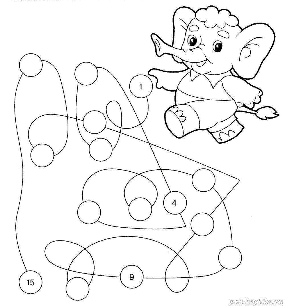Помогая слонёнку пройти по лабиринту, дети повторяют цифры от 1 до 15 и тренируют умение удерживать внимание