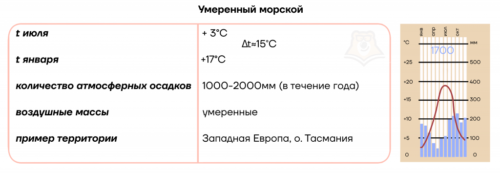 Формируется под влиянием на атмосферу океанических пространств. Для него характерны небольшие колебания температуры в течение года и суток, высокая влажность, а также запаздывание на 1-2 месяца самых высоких и низких температур. Наибольшее количество осадков выпадает зимой, осень здесь теплее весны. Самым тёплым месяцем считается август, а самым холодным февраль, всё это из-за того, что водные массы медленнее, чем суша, нагреваются и охлаждаются. Воздух морского климата отличается повышенным содержанием морских солей и малой запылённостью.